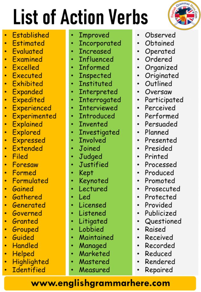 Below, you'll find lists of and details about action verbs, linking verbs, and helping verbs. Here we go!